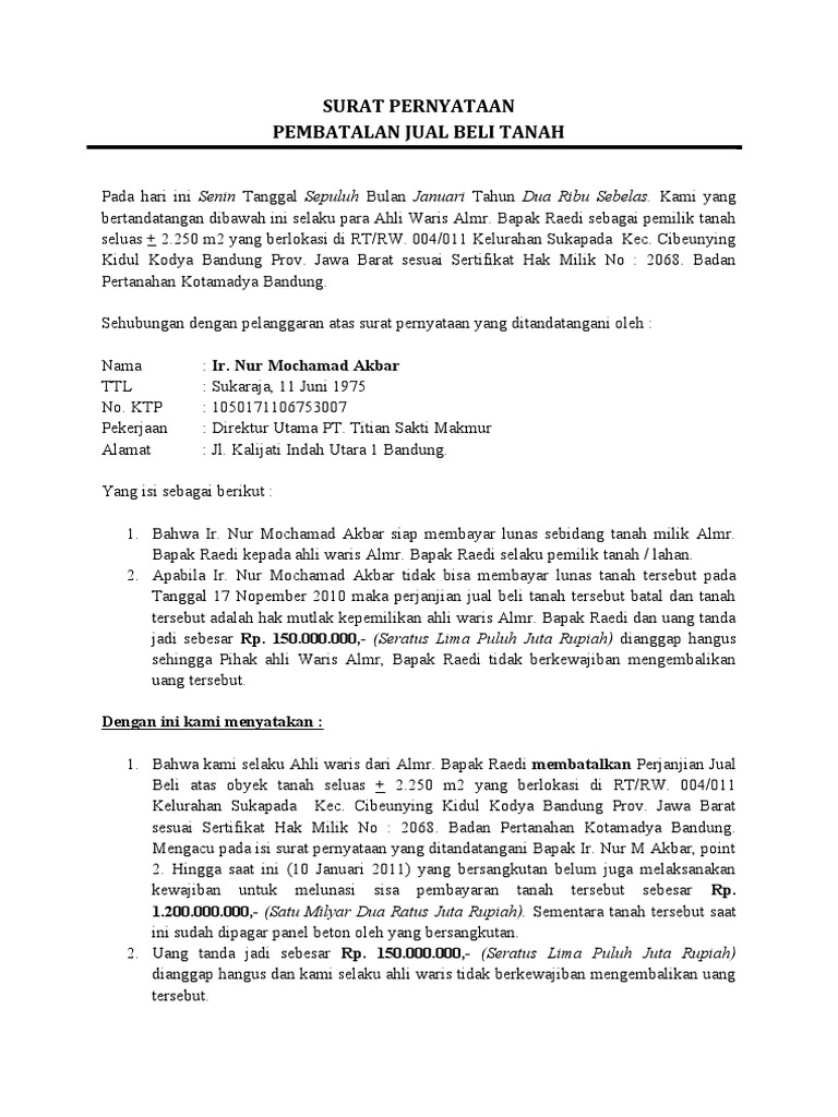Menjual tanah warisan tidak sama dengan menjual tanah biasa. Contoh surat jual beli tanah warisan yang baik dan benar. Membuat surat keterangan jual beli memang menjadi keharusan jika kita akan melakukan transaksi. Surat pernyataan penyerahan tanah merupakan bukti dokumen bahwa seseorang telah menyerahkan tanah yang dimilikinya kepada pihak lain baik itu melalui jual beli, hibah ataupun lainnya. Dalam proses jual beli tanah atau rumah warisan tersebut, semua ahli waris tidak perlu hadir. Pengurusan jual beli pun bisa diwakilkan oleh satu ahli waris yang telah diberi kuasa tersebut dengan adanya contoh surat pernyataan ahli waris. Perbedaan hanya terletak pada pihak penjual dan jika dalam jual beli biasa penjual atau orang yang namanya tercantum di sertifikat hadir untuk menandatangani akta jual beli, namun pada proses jual. Membuat surat jual beli tanah tidak begitu sulit meskipun terdapat format yang berbeda dari jenis surat lainnya. #jualbelitanah #aktajualbeli #perjanjianjualbeli contoh surat perjanjian jual beli tanah ini tentunya sangat berguna bagi anda yang hendak menjual maupun. Contoh kwitansi jual beli sebidang tanah. Fungsi materai pada surat perjanjian. Adapaun contoh dari surat jual beli tanah dapat dilihat sebagai berikut tanah warisan juga sering dijual oleh para ahli warisnya. Dengan demikian tidak ada yang bisa melanggar aturan yang sudah dibuat oleh kedua belah pihak dalam hal jual beli.